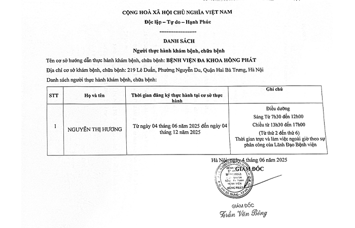 DANH SÁCH ĐĂNG KÝ THỰC HÀNH KHÁM CHỮA BỆNH TẠI BỆNH VIỆN ĐA KHOA HỒNG PHÁT